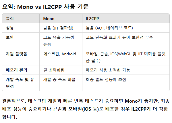 - 반면, Mono는 JIT(Just-in-Time) 컴파일 방식을 사용합니다. 코드 실행 중에 필요한 부분을 즉시 컴파일하므로 개발 중에는 빠른 실행과 테스트가 가능하지만, 최종 빌드 성능에서는 IL2CPP가 더 뛰어납니다.